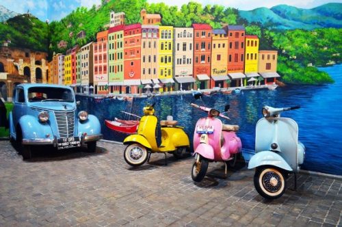 Nuansa kota-kota Eropa seperti, London, Paris dan Holland dijadikan satu disini dengan sederetan cafe-cafe yang romantis, apalagi dibalut dengan suasana malam yang temaram. Deretan rumah-rumah seperti di pedesaan Edensor, sepanjang jalan di meriahkan dengan mobil-mobil lama buatan Eropa, seperti Volkswagen, Classic Rolls, Ferrari dan masih banyak lagi, kita bisa berselfie ria disini dengan mobil dan Vespa klasik berwarna pastel.